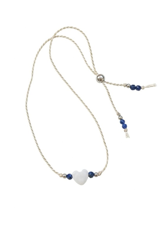 Połączeniu tajemniczej czerni z błękitem morskich głębin. Akwamaryn wspiera asertywność i pomaga w wyrażaniu własnych myśli. To subtelny dodatek, który przypomina o zachowaniu spokoju w każdej sytuacji. Dodatek serca z masy perłowej dodaje bransoletce lekkości i ponadczasowej elegancji.