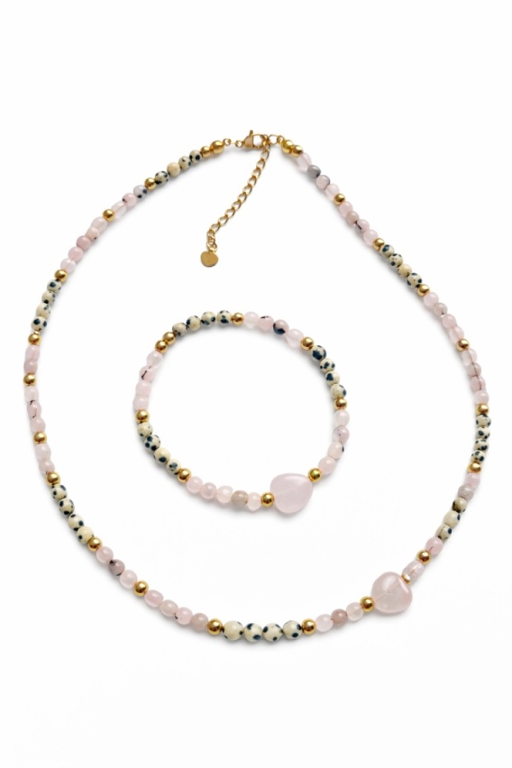 Serce z Kwarcu: Centralnym punktem obu elementów są urocze zawieszki w kształcie serca, wykonane z kwarcu różowego, które podkreślają romantyczny charakter zestawu.