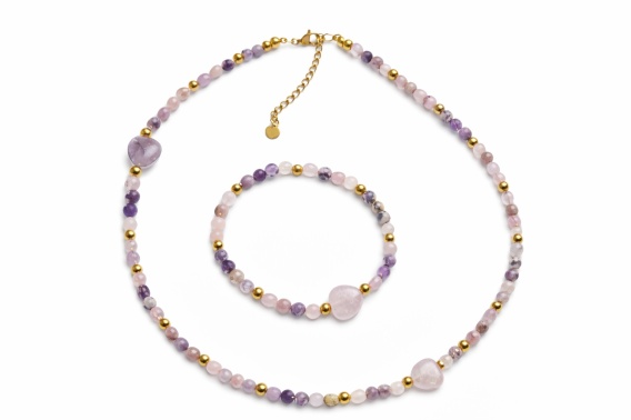Zanurz się w kojących barwach natury. Ten ręcznie wykonany komplet, składający się z naszyjnika oraz bransoletki, to połączenie szlachetnych fioletów i subtelnych pasteli, które wniesie harmonię do każdej Twojej stylizacji. Centralnym punktem zestawu są unikalne zawieszki w kształcie serca z ametystu, symbolizujące miłość i wewnętrzne dobro.